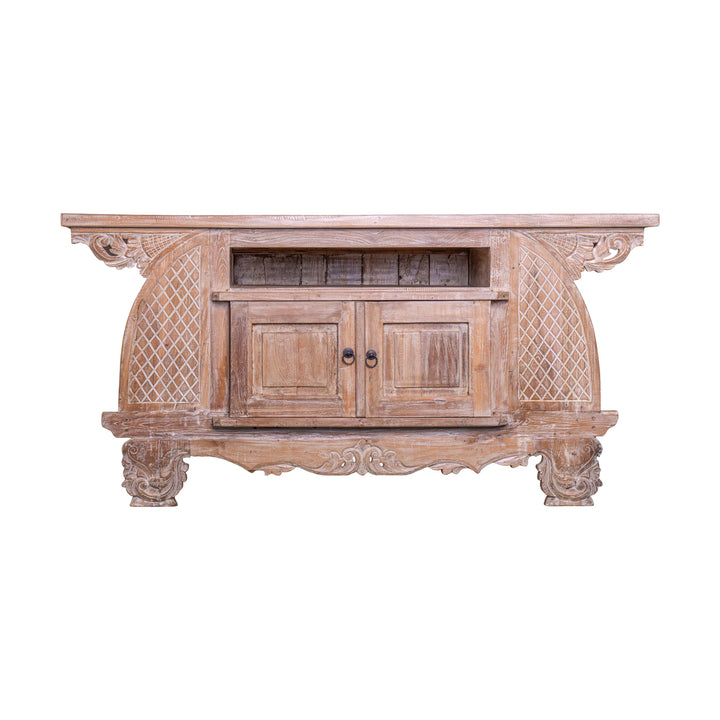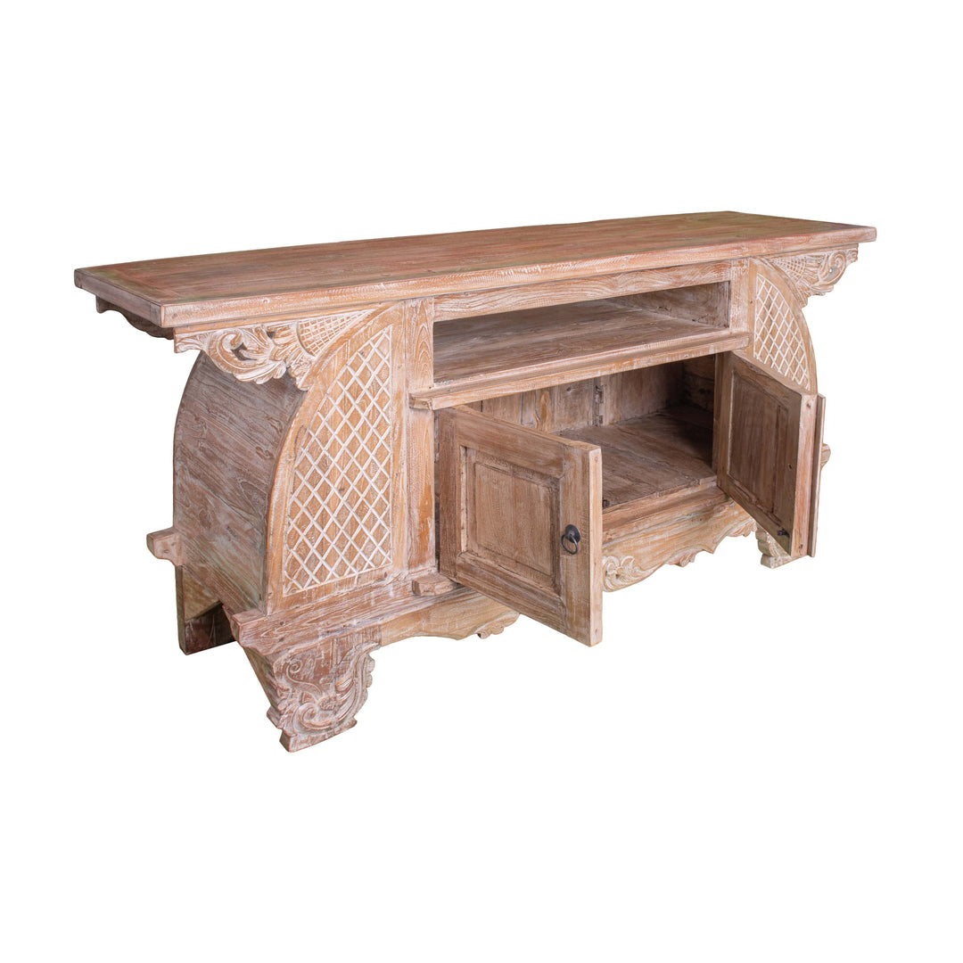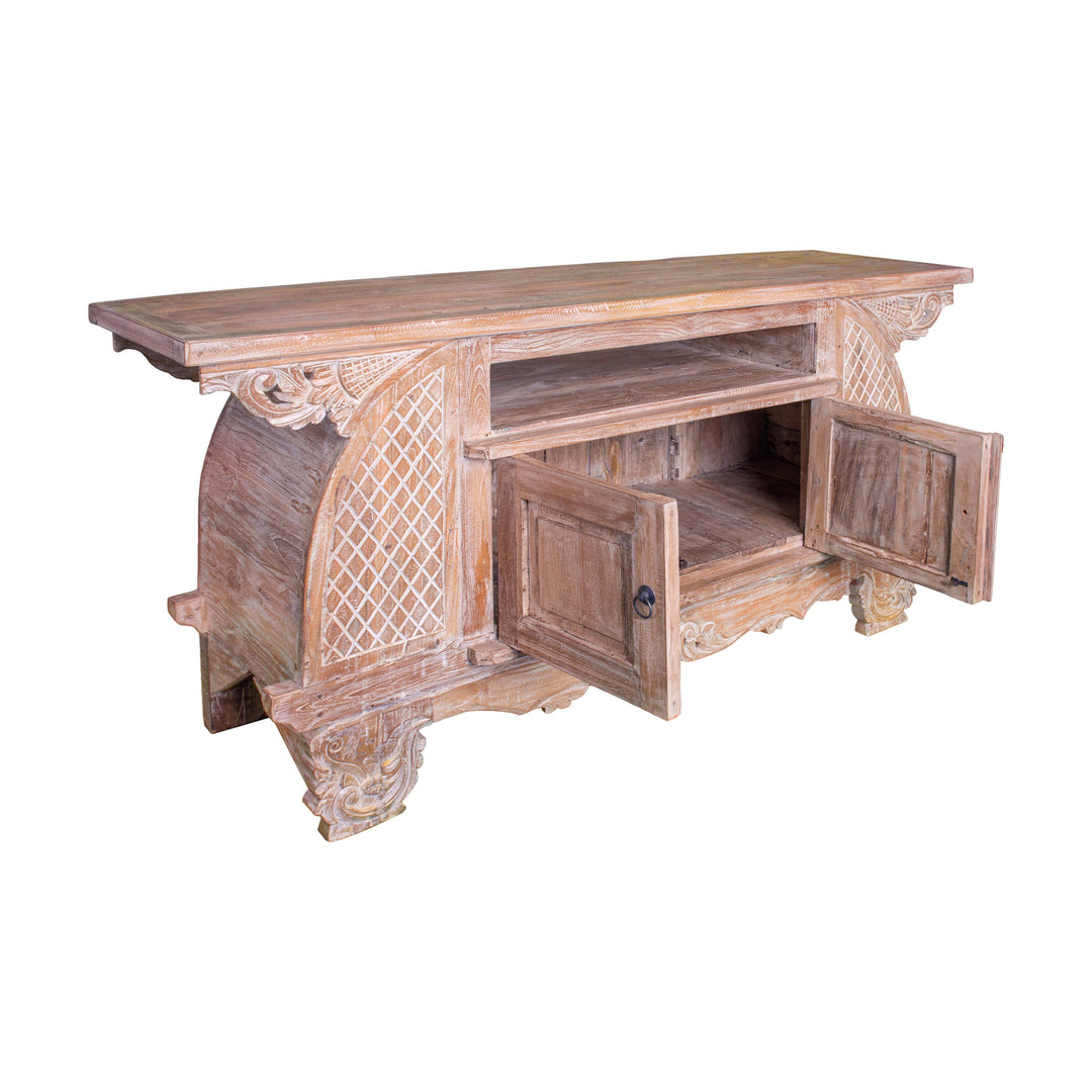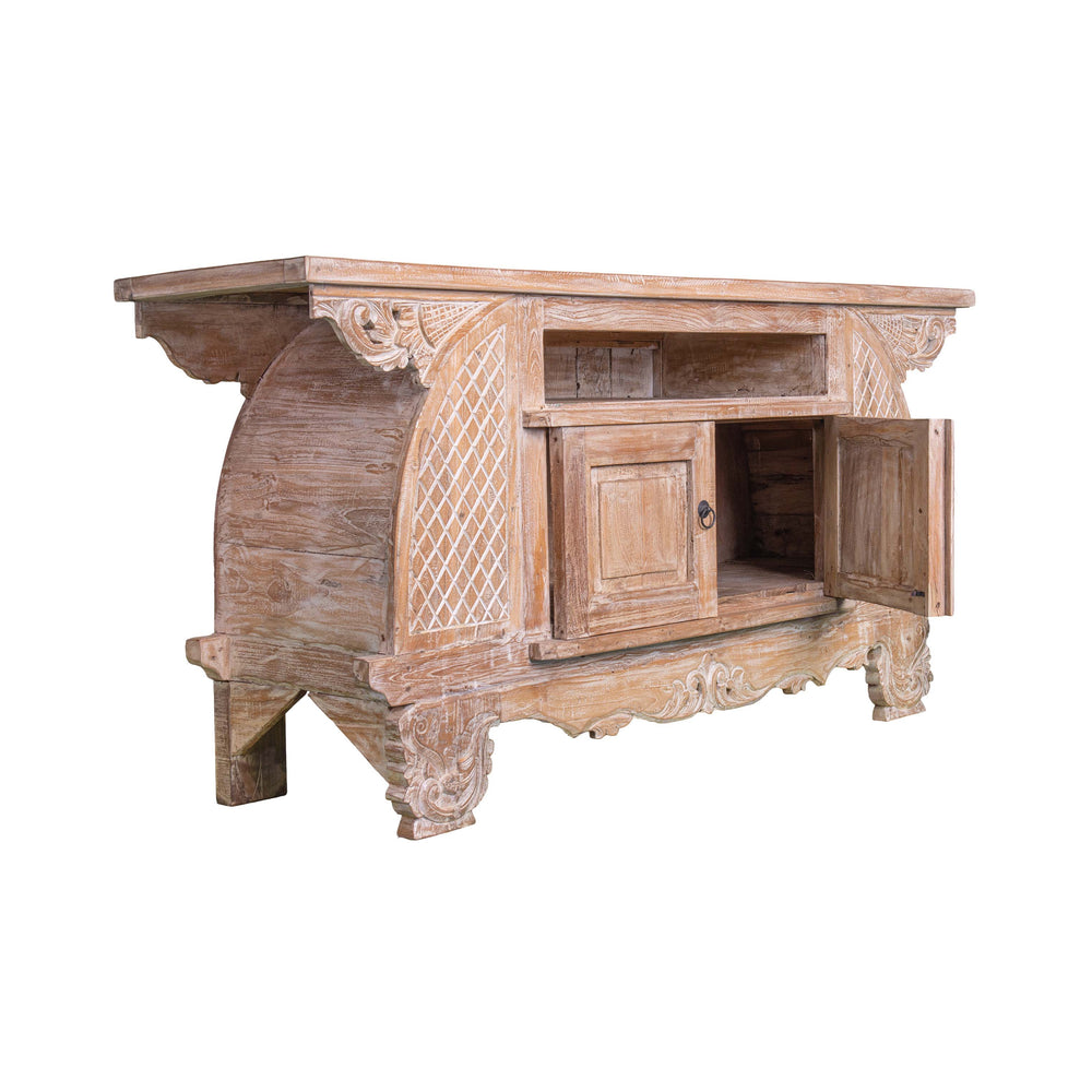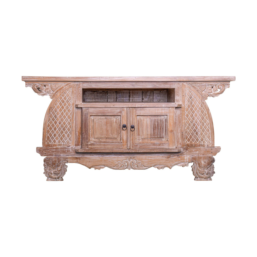 Comoda din lemn de tec reciclat, sculptata manual, cu raft, doua usi si spatiu de depozitare. Elementele decorative rustice, patina si forma deosebita vor eleva instant orice spatiu.