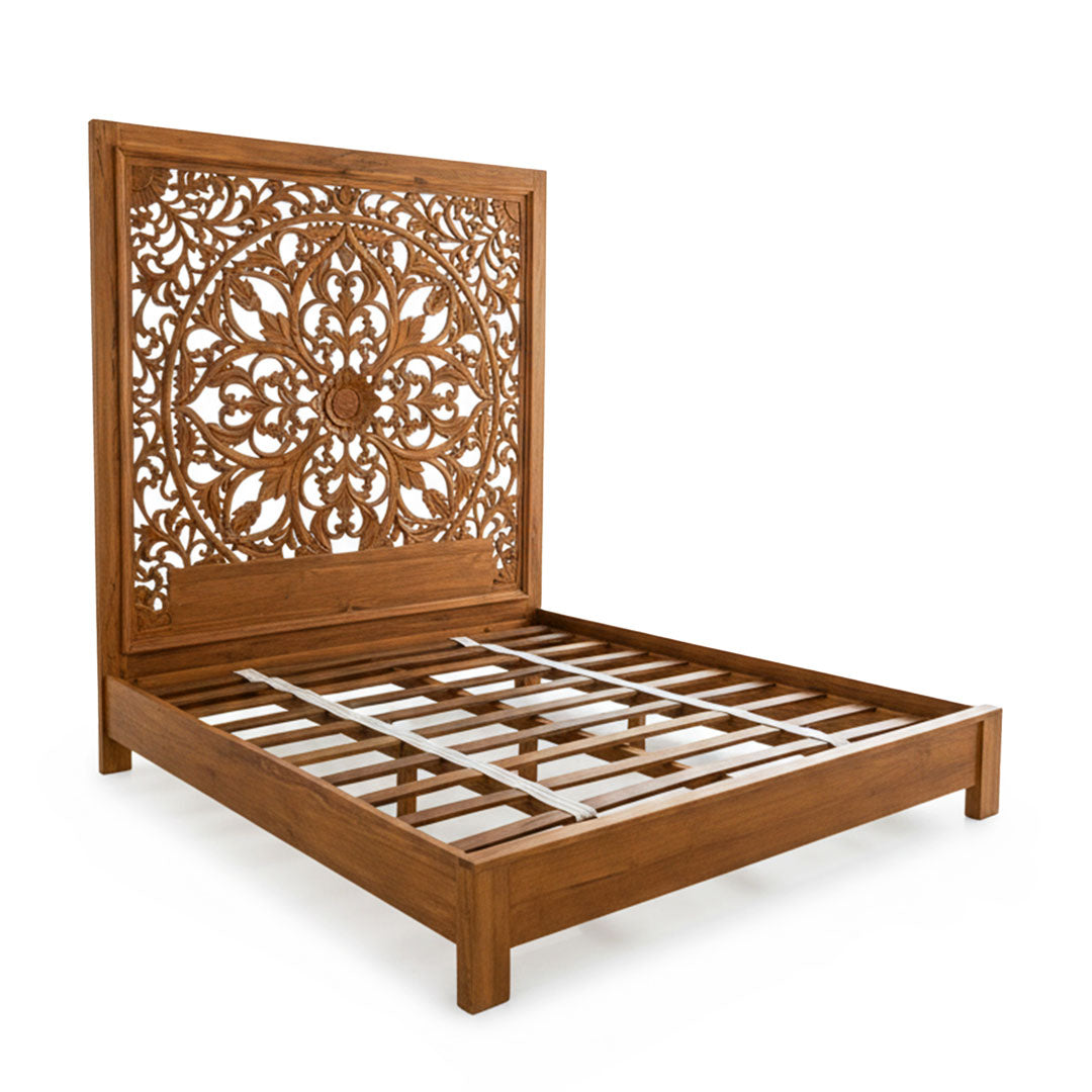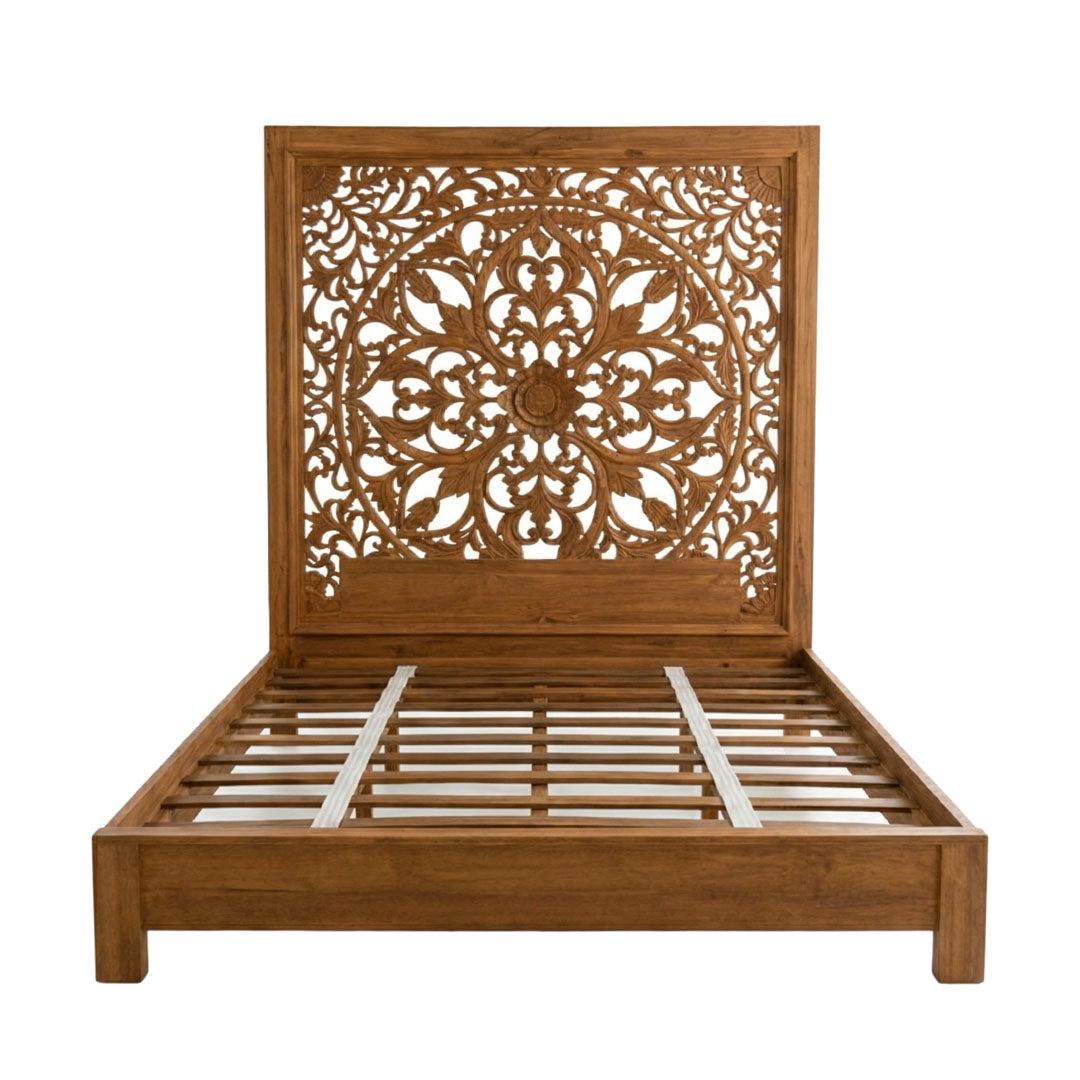 Patul Mandira 180x200 cm, in finisaj maro, este o piesa statement sculptata manual din lemn masiv de tec, ce aduce eleganta si profunzime in amenajarea dormitorului. Tablia inalta, decorata manual cu motive florale si organice, reflecta traditia artizanala si atentia pentru detalii.