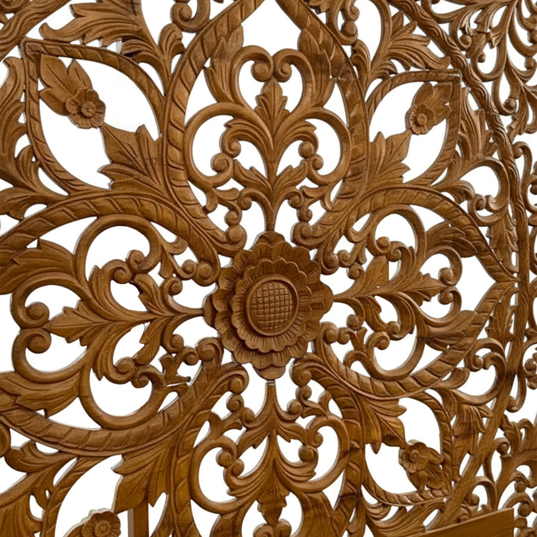 Simbolistica sculpturilor evoca armonia, cresterea si echilibrul, creand o atmosfera calma si relaxanta. Finisajul maro accentueaza detaliile sculptate si textura naturala a lemnului de tec, oferind un aspect sofisticat si cald.